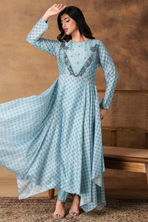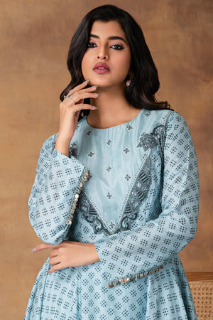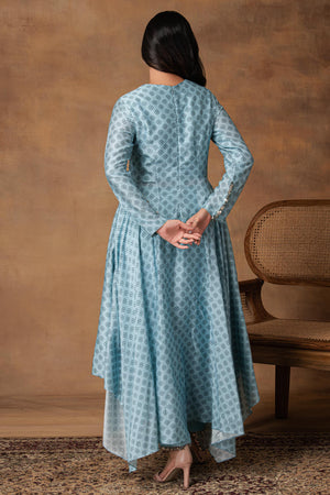 This pastel blue and black printed, asymmetrical Kurta Set is where tradition meets striking contemporary design. Crafted in mughal booti printed light Chanderi fabric, the silhouette flows effortlessly. The highlight of the piece is the contrast-embroidered yoke, detailed with fine dori and beadwork, forming an artful frame. Adding to the subtle drama are handmade tassels — playful yet refined — that sway with every step, giving the look a festive soul - making it perfect for festive days, mehendi lunches, or destination gatherings.