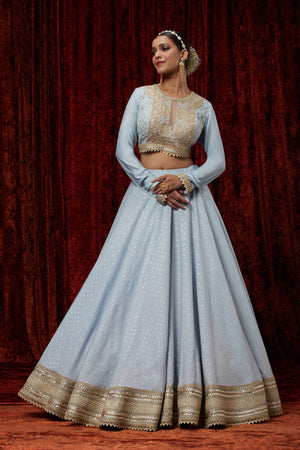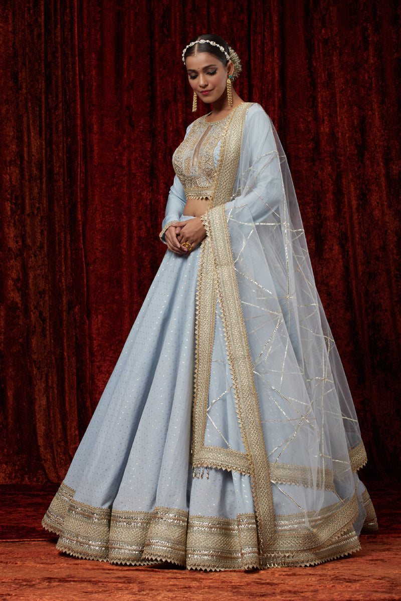 Featuring This Powder Blue Cotton Chanderi Lehenga With Fine Gota Work. It's Paired With Embroided Chanderi Blouse And Net Dupatta.