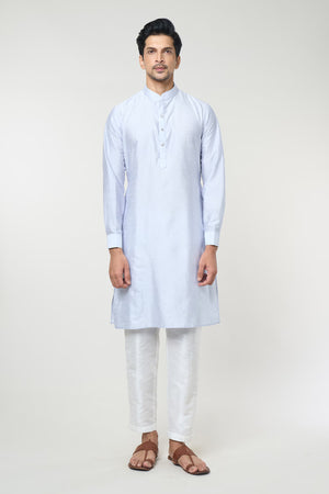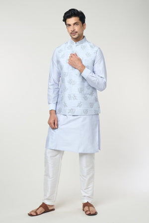 Powder Blue raw silk based jacket, enhanced with thread and sequin embroidered motifs, paired with a matching dupion silk based kurta and an off white dupion silk based mexican pants.