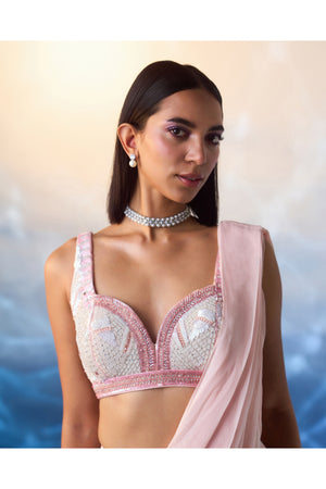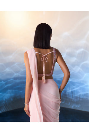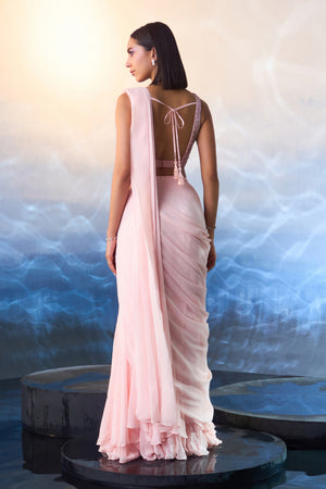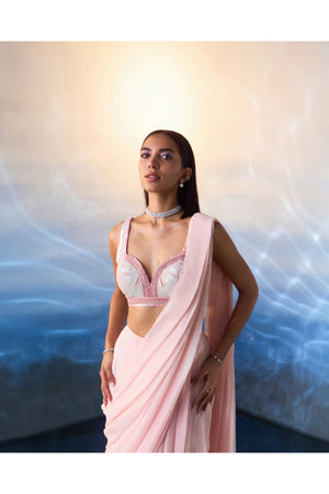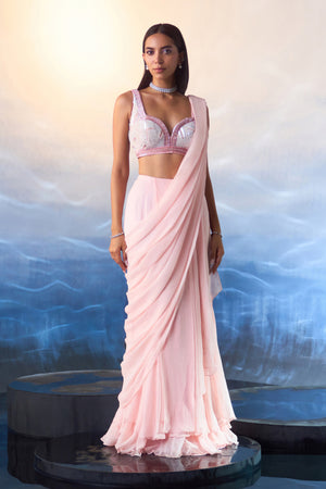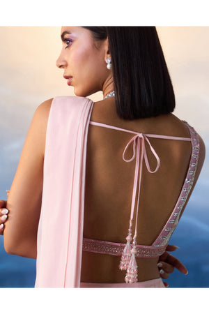 A powder pink draped georgette saree paired with a hand embroidered blouse using multi colored sequins, crystals and bugle beads.