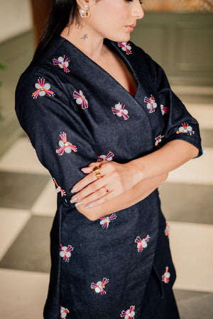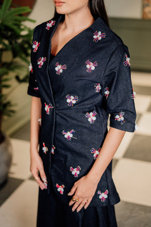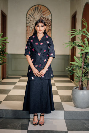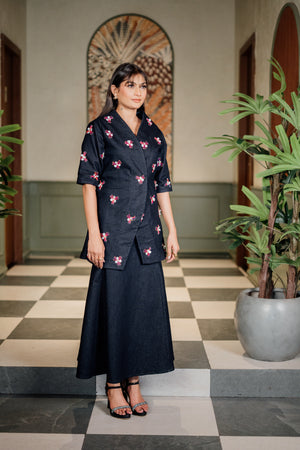 Elevate your wardrobe with this elegant denim co-ord set, perfect for both festive and formal occasions. The ensemble features a beautifully tailored wrap-style top adorned with intricate pink and white floral embroidery, offering a touch of femininity and charm. The top’s structured fit, three-quarter sleeves, and deep V-neckline flatter all body types. It is paired with a flowy, ankle-length skirt. Crafted from premium-quality fabric, this set combines comfort with style, making it a versatile addition to your collection. Style it with heels and delicate jewelry for a refined, polished look.
