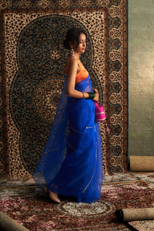 The blue organza saree is a perfect choice for Diwali, featuring intricate embroidery that adds both texture and elegance. Paired with a contrast colour Saffron blouse, this ensemble creates a seamless and sophisticated look. The delicate organza fabric drapes beautifully, accentuating the detailed embroidery, while the coordinated blouse enhances the outfit's harmony. Ideal for Diwali, this combination ensures you make a chic and stylish statement during the festivities.