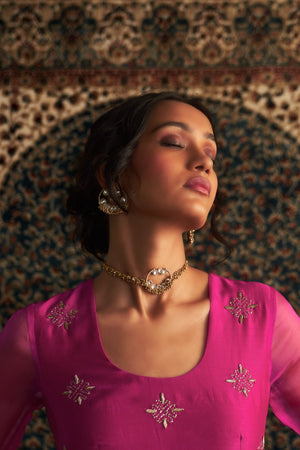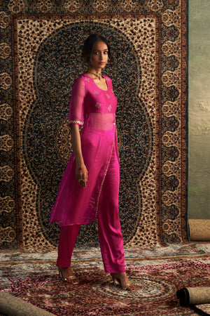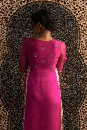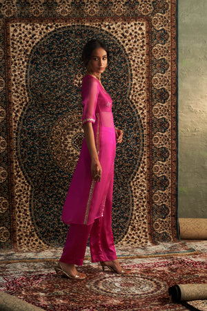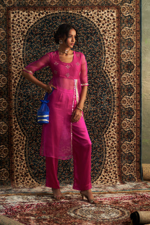 This Rani Pink Kurta blends timeless charm with modern sophistication. The bustier, crafted from luxurious chanderi fabric, is adorned with delicate dabka and zari embroidery, adding a regal touch. The flare of the kurta, made from ethereal organza and embellished with intricate mirror and gota work, is perfectly complemented by a stylish front slit, creating a graceful silhouette. Organza sleeves with dainty gota detailing elevate the look further, ensuring a seamless and polished appearance. Paired with sleek straight pants, this ensemble becomes a striking statement piece, exuding grace and style at any celebration. With its meticulous craftsmanship and contemporary design, this kurta promises effortless elegance and a lasting impression