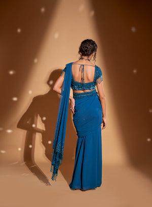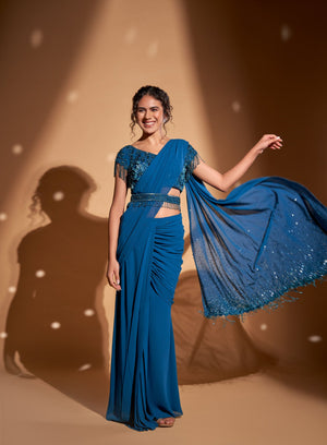 Pre-draped georgette saree with side pleats, pallu embellished with cheeta work and tassels, fully hand- embroidered net blouse with tassels