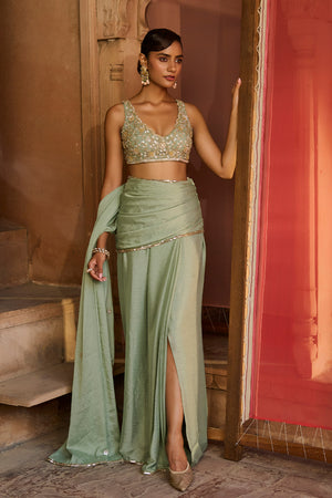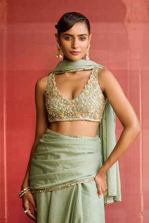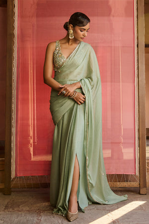 Featuring a sage green colour pre-stiched saree in georgette with a slit in the side and hand embroidery. It is paired with a net blouse with heavy hand embroidery and an embroidered scallop neckline. The saree has hand embroidered motifs all over it.