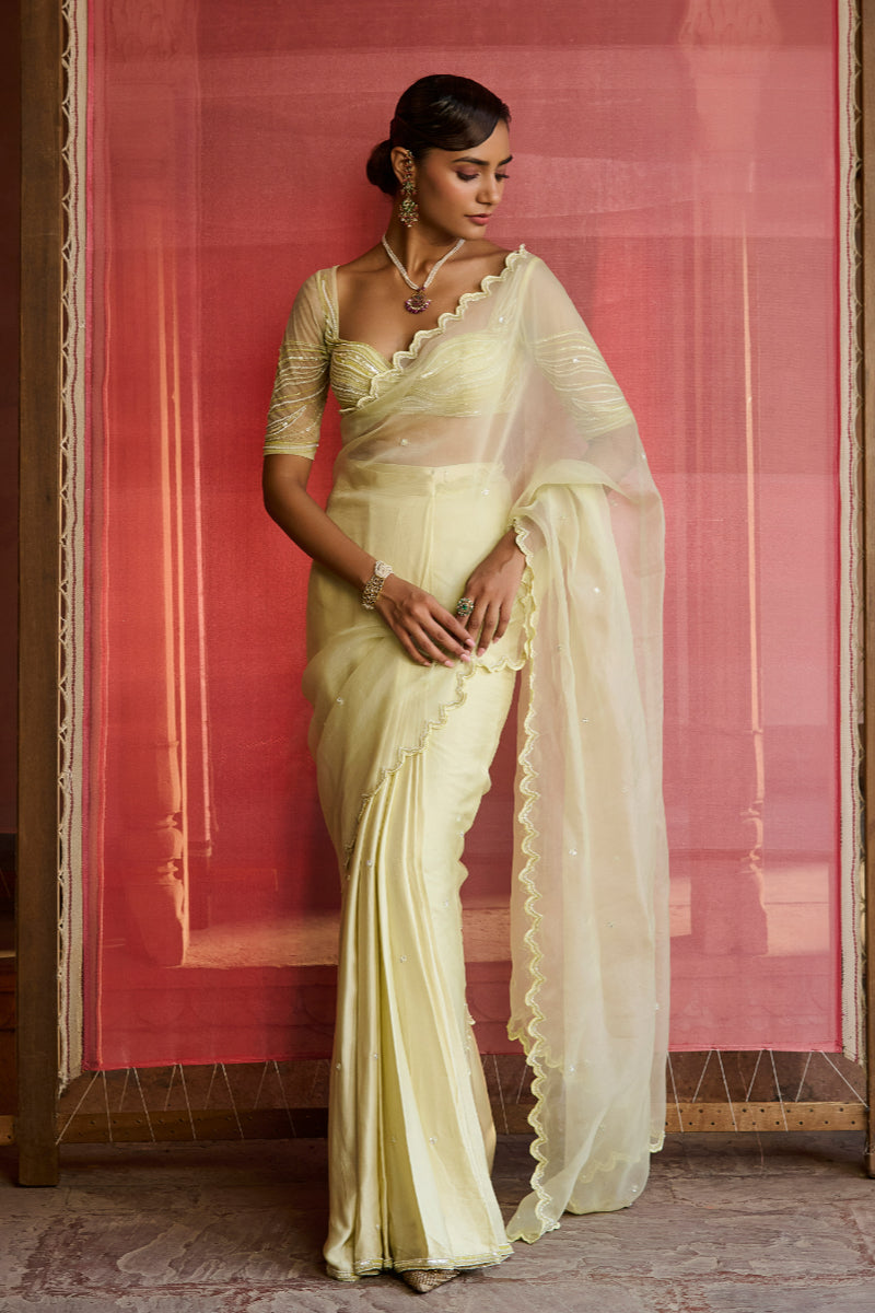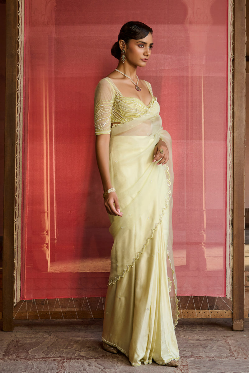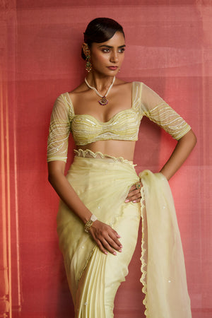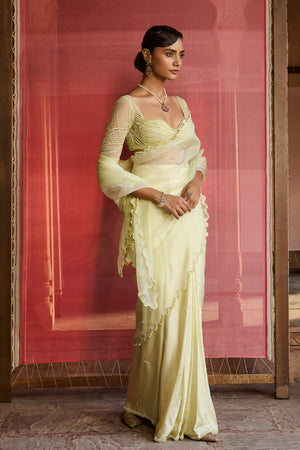 Featuring a lime pre-pleated saree in satin base and organza pallu with hand embroidered motifs all over and a cutwork embroidered border in the pallu. It is paired with matching blouse in net with heavy intricate hand embroidery.