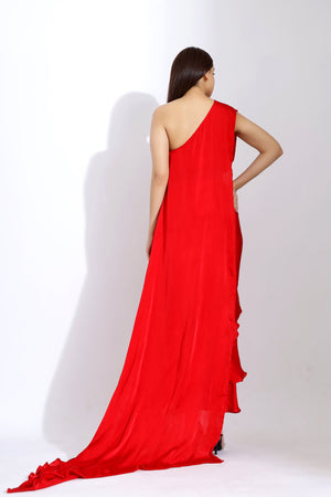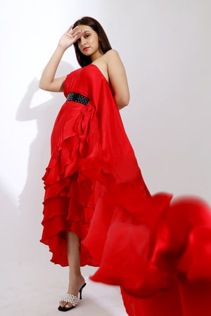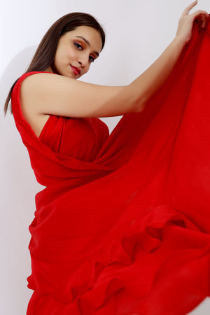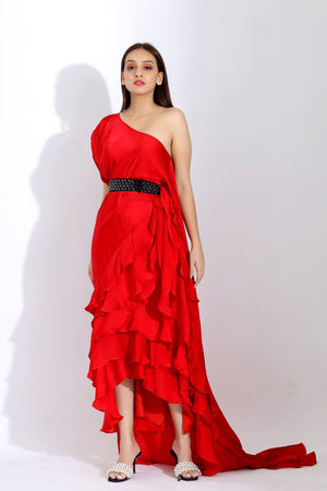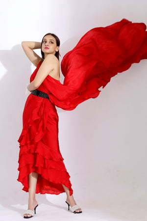 Featuring A Black Georgette Satin Pre-Stitched Frill Saree With An Oversized Collar Pallu Paired With A Matching Blouse And An Embellished Belt.