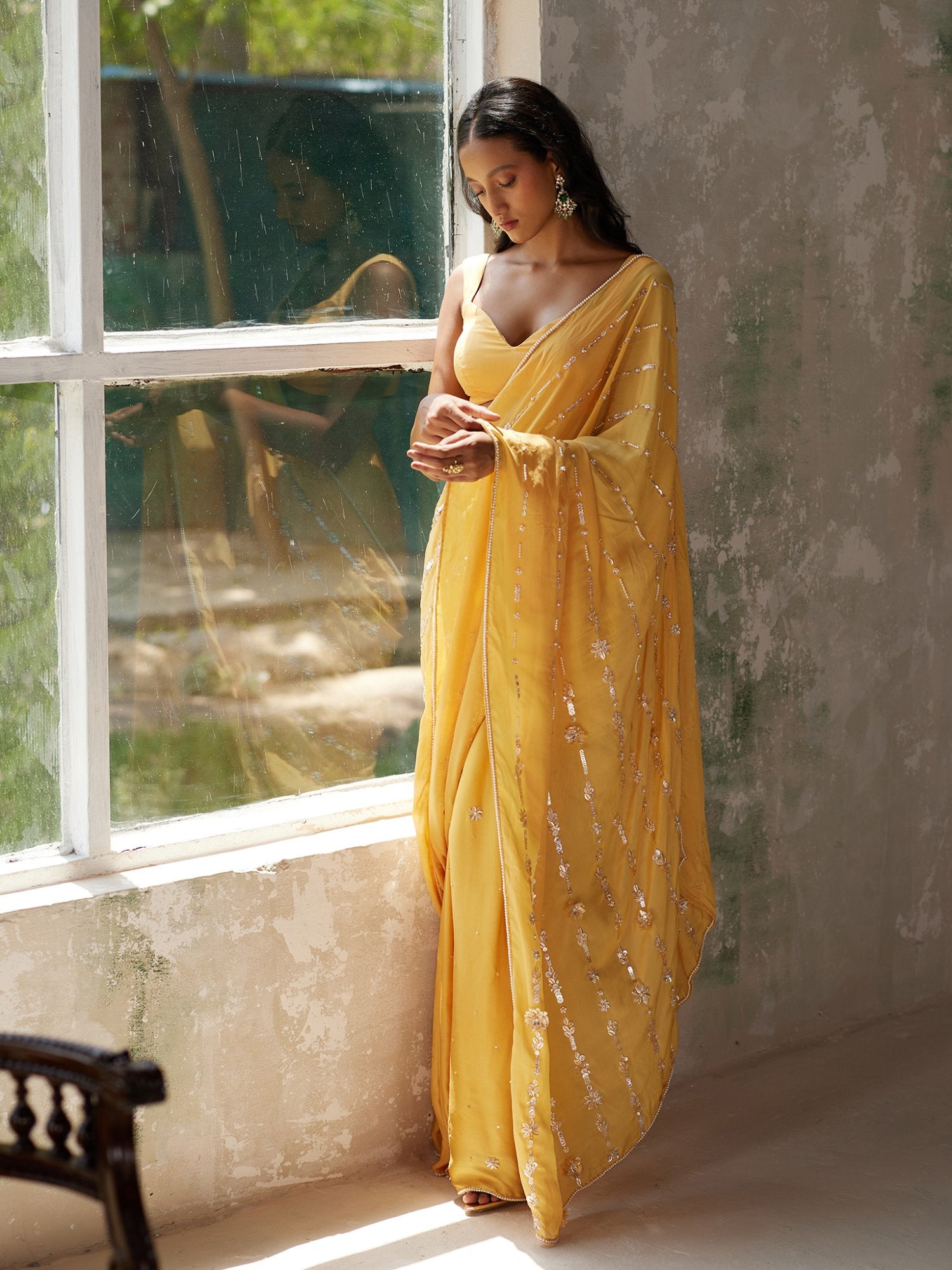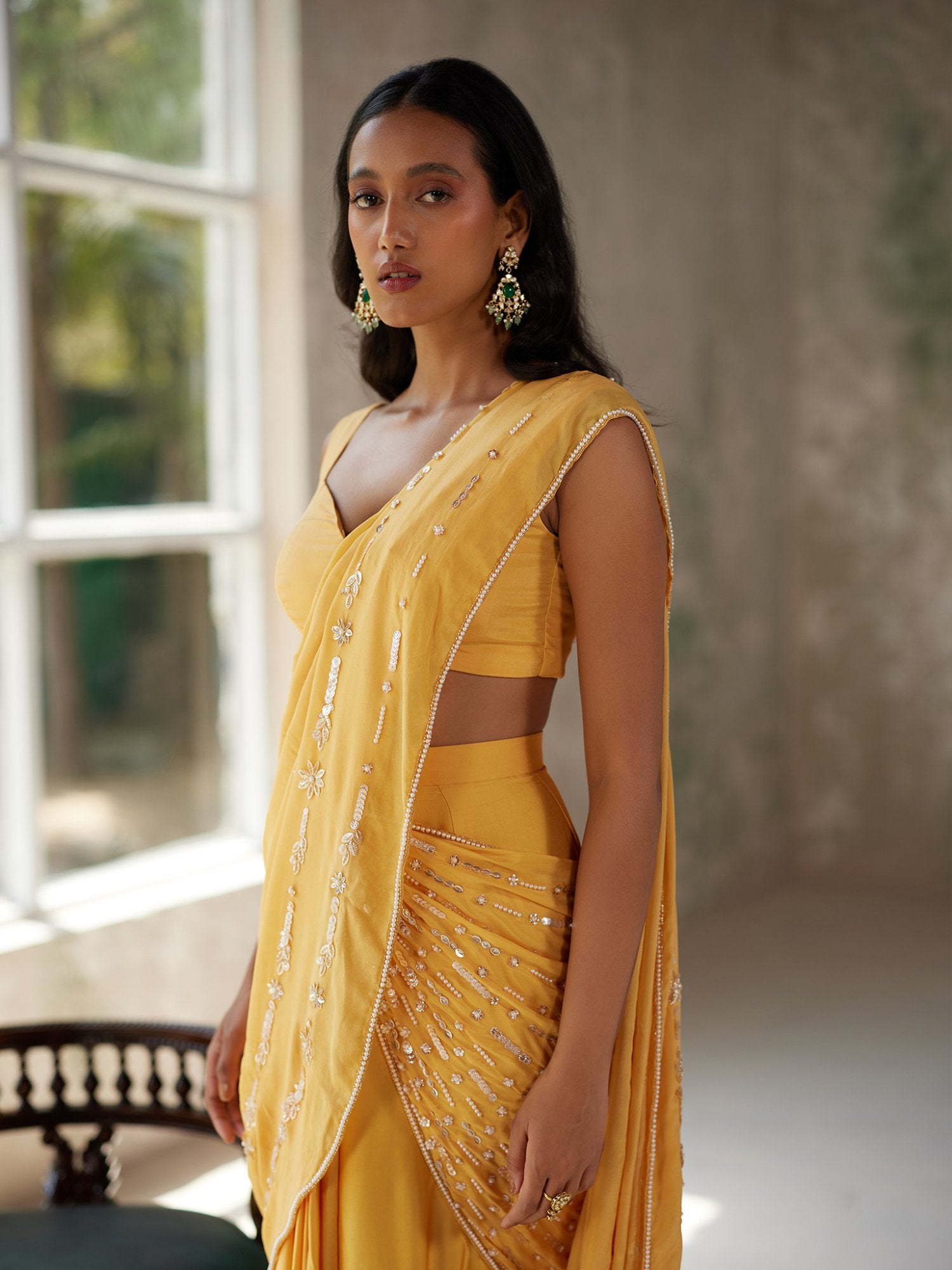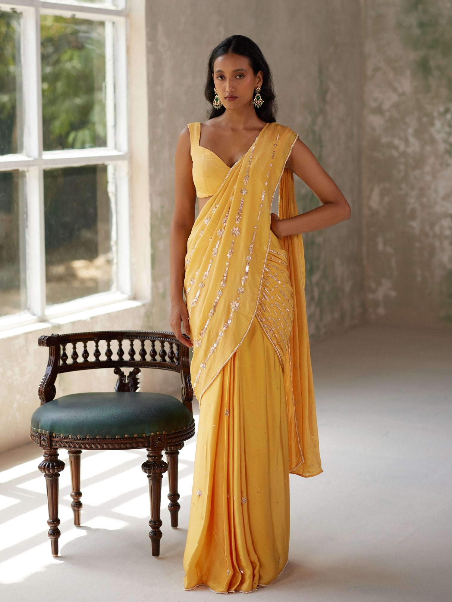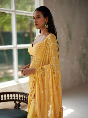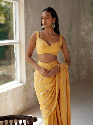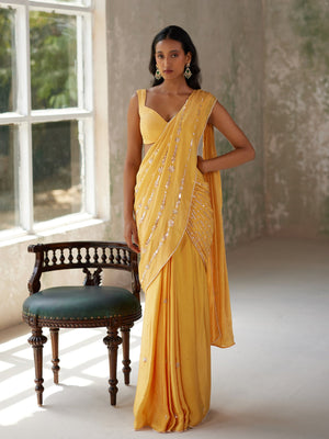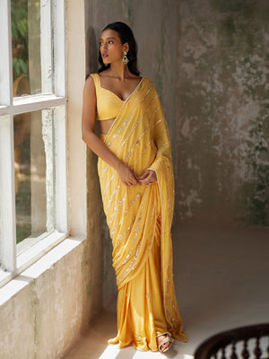 Featuring a sunshine yellow pre-pleated saree in satin base and flat chiffon drape with aari hand embroidered motifs. It is paired with a matching blouse in silk flat chiffon.