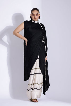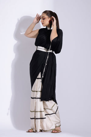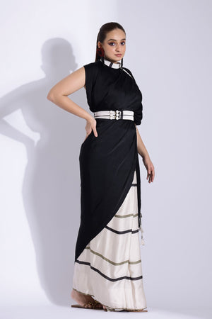Featuring A Georgette Satin Pre- Stitched Pre- Pleated Digitally Printed Sari With A Solid Color Collared Pallu With A Contrast Gathered Piping Detail On The Shoulder Paired With A Blouse And A Belt With Contrast Piping Detail On Top.
