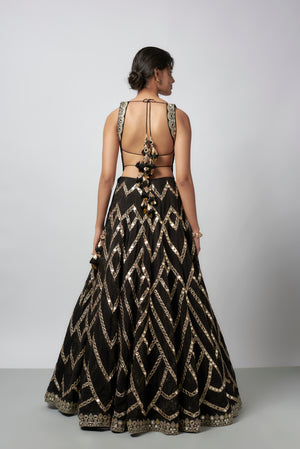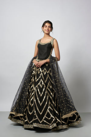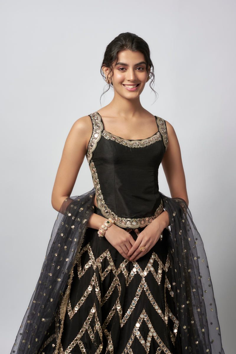 Featuring blouse with intricate gold embroidery along the neckline and straps. Paired with it is a voluminous lehenga adorned with mirror work and gold geometric patterns, creating a striking visual impact. The look is completed with a net dupatta, subtly embellished with gold accents for a graceful touch.