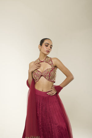 A sultry symphony in wine — this hand-embroidered blouse with sculpted cuts pairs effortlessly with a gathered crepe skirt, Paired with net dupatta, blending softness and structure in a silhouette made to mesmerise.