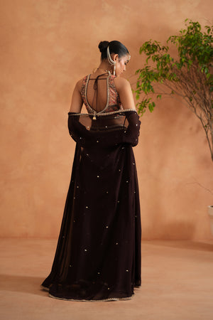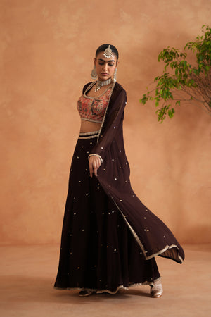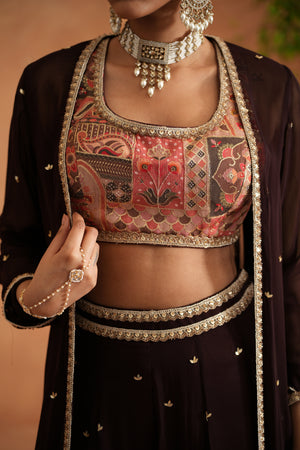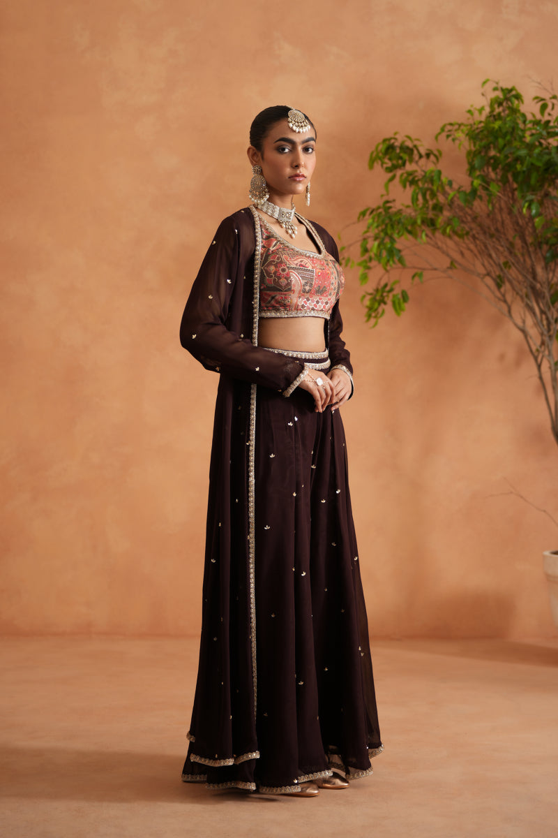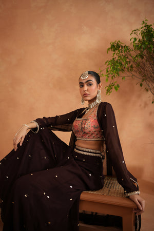 Deepika Chadha's stunning Brown printed chinnon fabric blouse, beautifully adorned with gold borders. The flowy brown georgette sharara, highlighted with embroidered bootis, adds a touch of tradition and sophistication to your look, while brown georgette long jacket highlighted with bootis and golden borders keeps you light and comfortable all day long and is perfect for wedding and festive season.