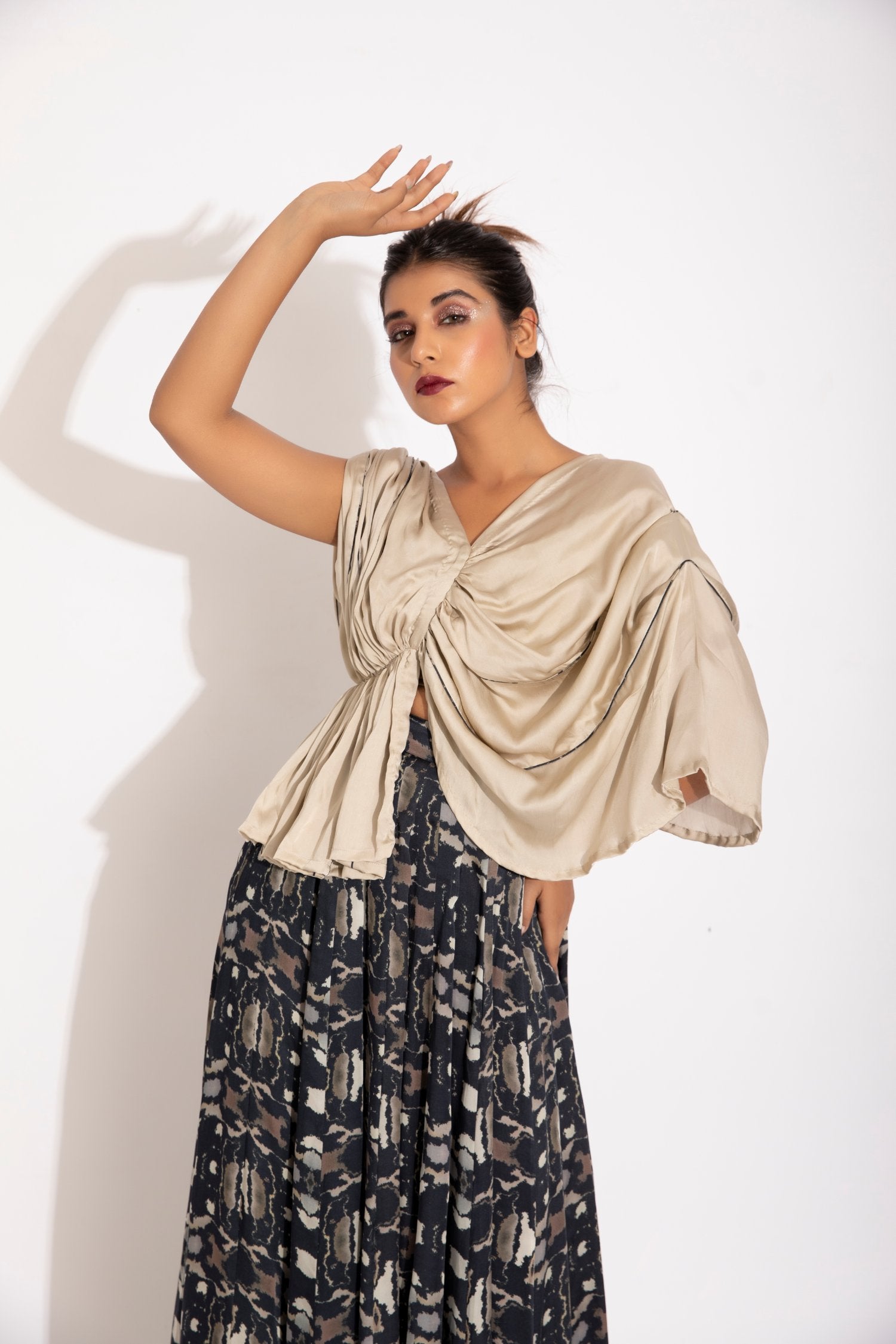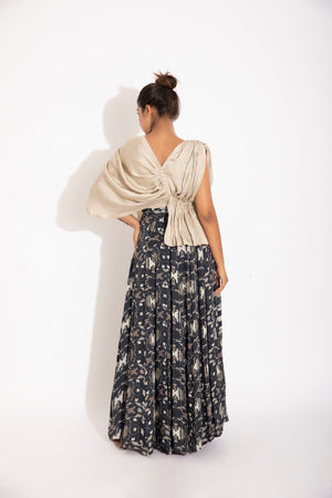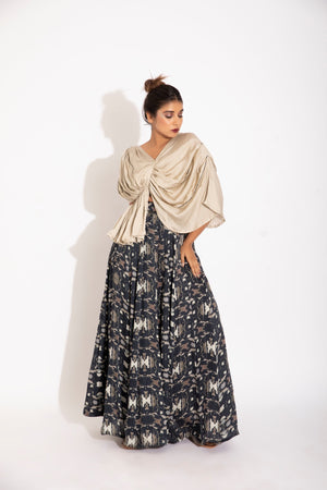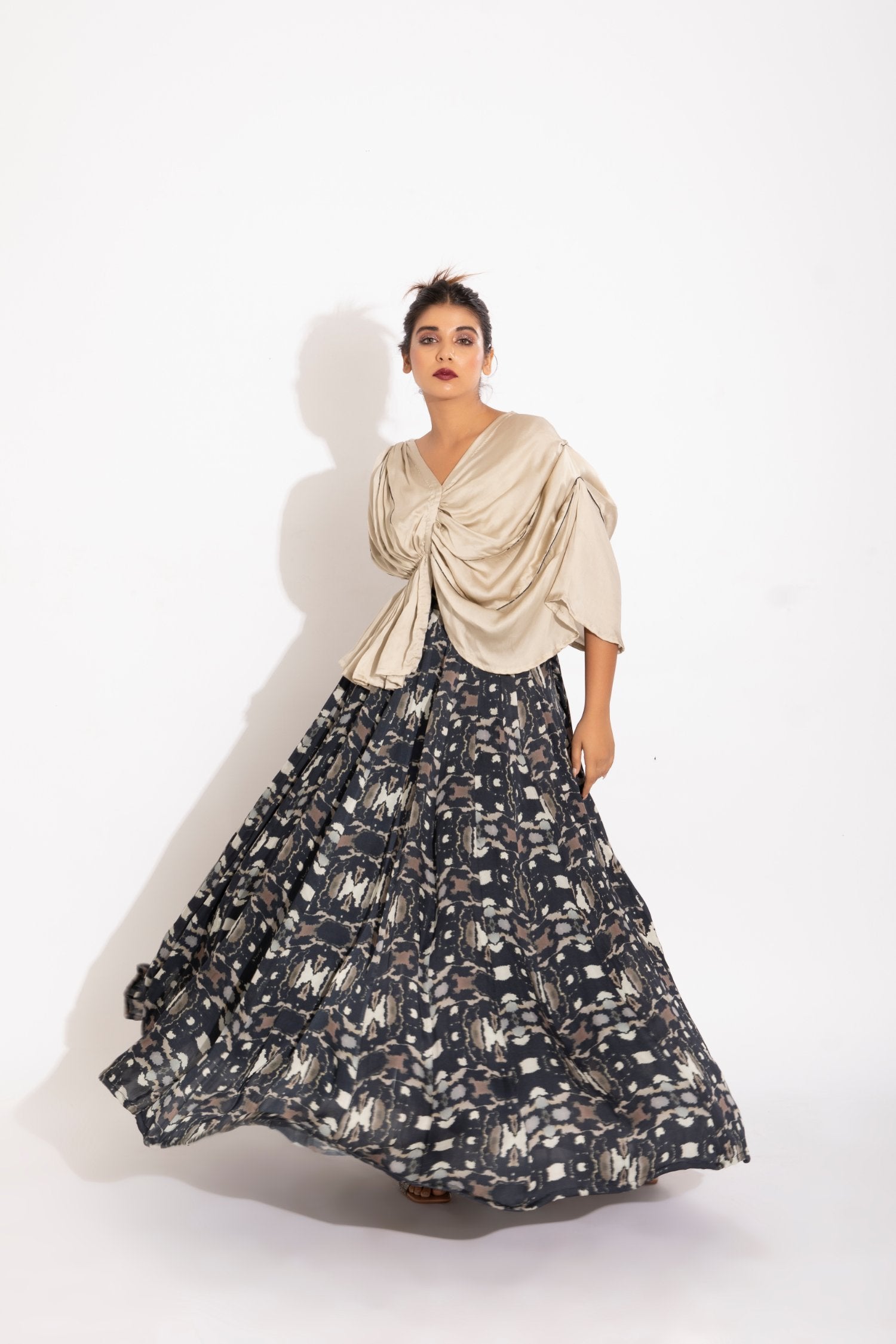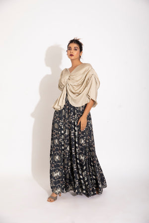 Featuring A Two-Piece Overall Solid Color Draped Blouse Attached Over A Fitted Blouse With Contrasting Piping Detail On Top Paired With A Digitally Printed Georgette Satin Kalidar Skirt