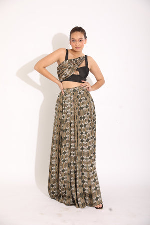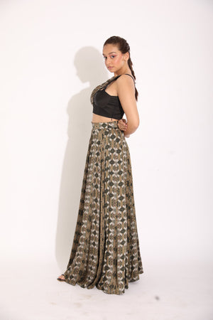 Featuring A Black Georgette Satin Bustier With A Center Cut And A Digitally Printed Georgette Satin Drape With Contrasting Piping Detail On Top Paired With A Digitally Printed Georgette Satin Kalidar Skirt