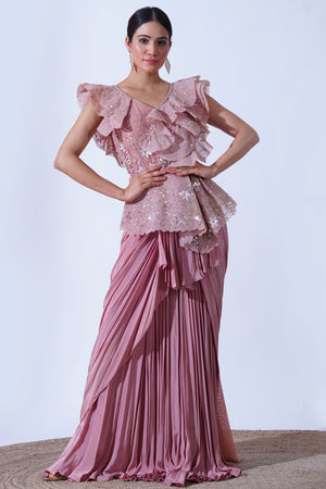 Make a statement in our Onion Pink Crepe Saree Gown, featuring a structured shoulder and paplum bodies for a modern and chic silhouette. This versatile piece effortlessly combines the grace of a saree with the contemporary appeal of a gown, ensuring you stand out at any special occasion.