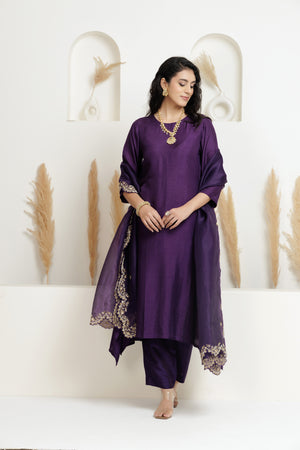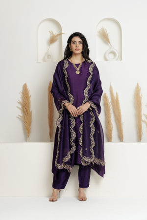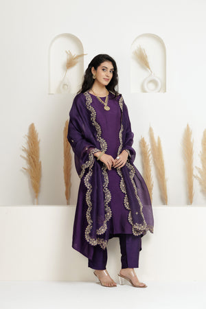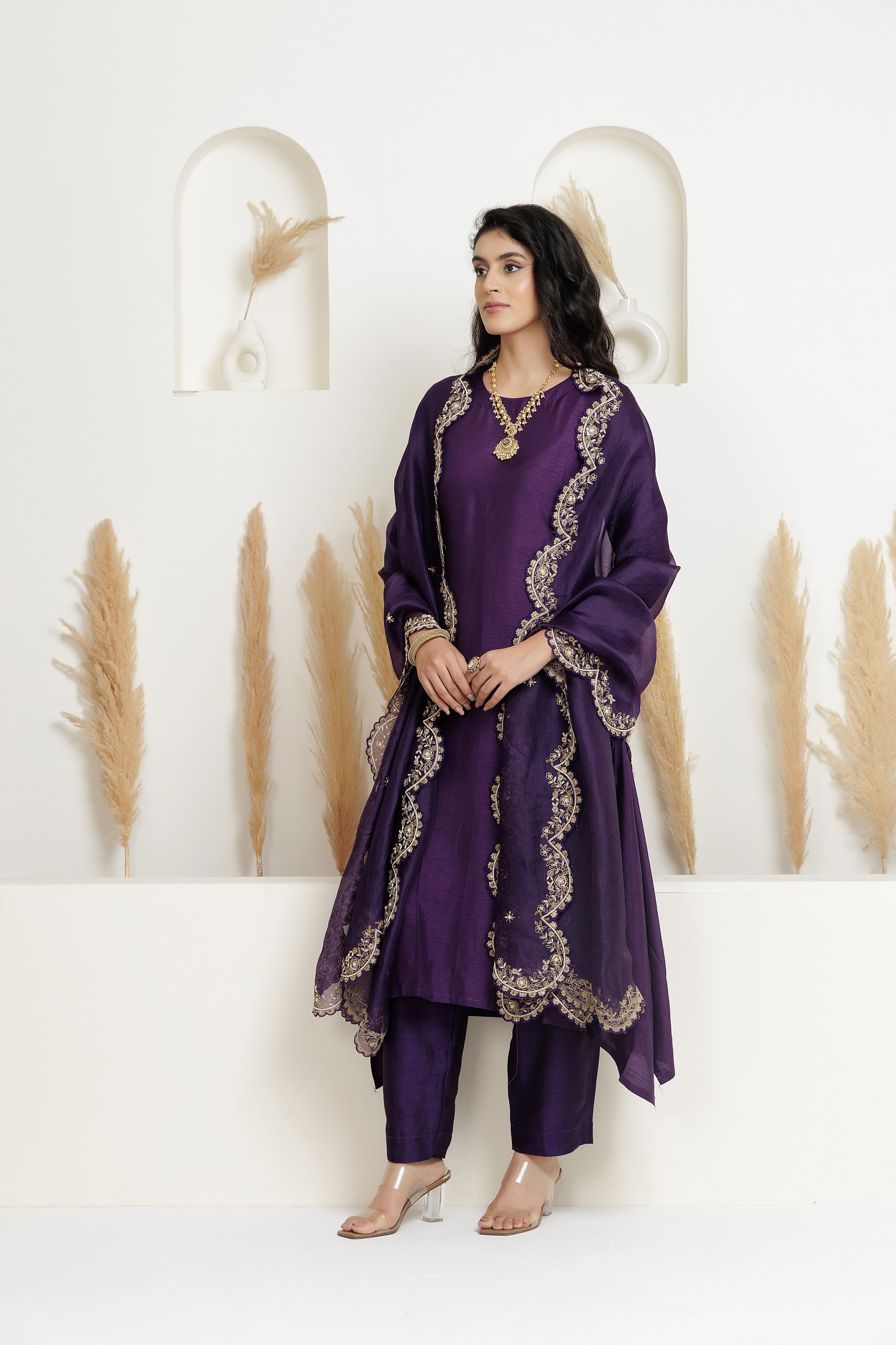 Purple A line Suit in dupion silk base with pure organza Scallop pearls, sequins, zari, beads embroidery. Perfect for a mehendi, sangeet or festive ceremony.