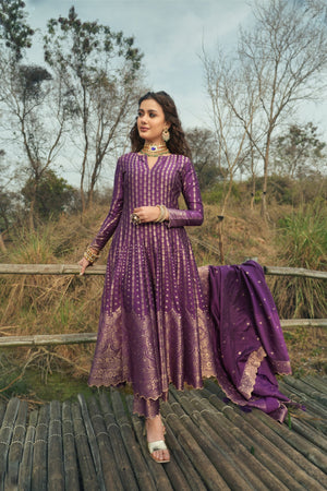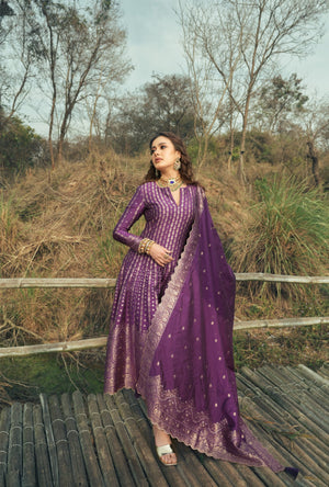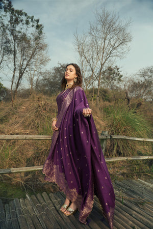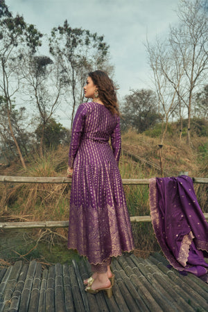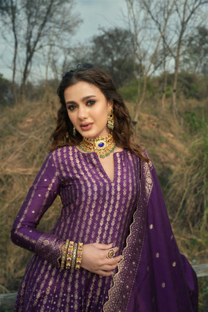 Introducing the Adeena Anarkali, a majestic ensemble that epitomizes regal charm and timeless beauty. Crafted from luxurious vegan silk in a captivating shade of purple, this woven vertical design pattern anarakali with scalloping on the borders exudes elegance and sophistication. Its flowing silhouette, adorned with intricate detailing and exquisite craftsmanship, creates a mesmerizing aura that commands attention.