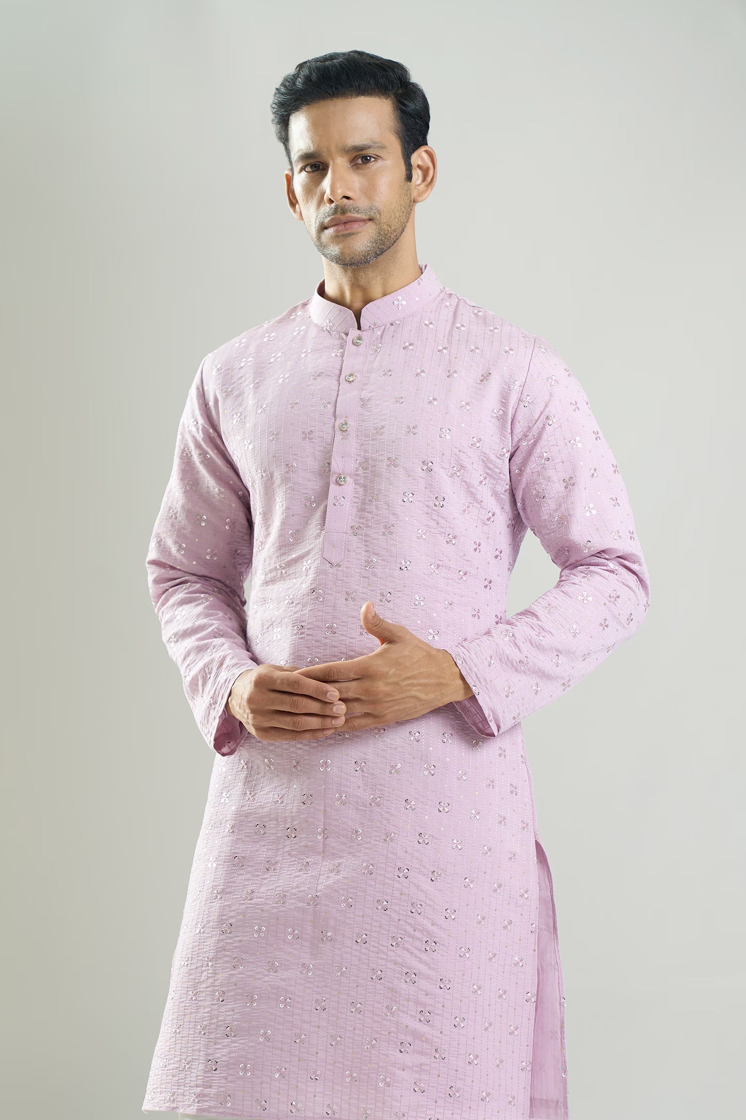 Purple silk based kurta enhanced with resham and sequins embroidery, paired with an off white dupion silk based pants.