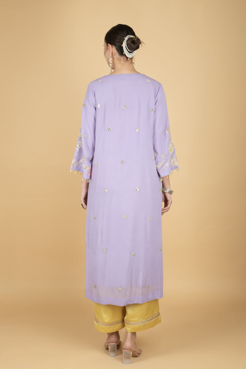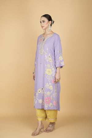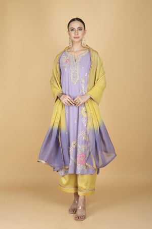 Featuring embroidered georgette purple kurta, paired with a contrasting modal silk pants with detailed work on edges. Shaded contrasting dupatta