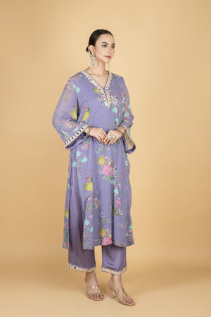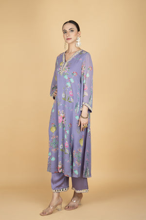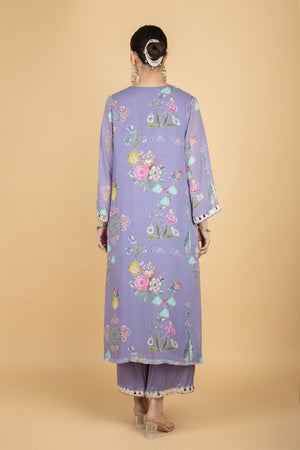 Featuring a purple floral printed kurta in crepe, highlighted with intricate mirror embroidery. Paired with modal silk pants adorned with mirror work on the edging and a complementing organza dupatta.