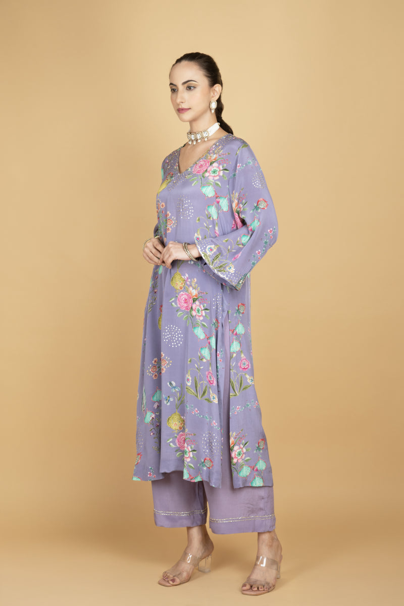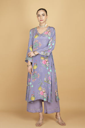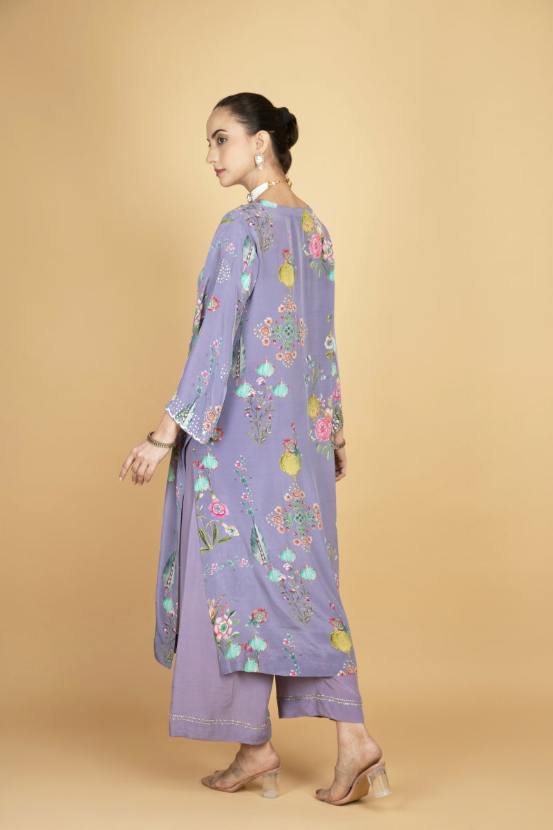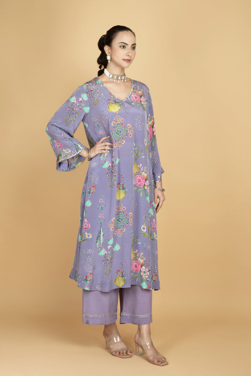 Purple Floral Printed Sequin Embroidery Kurta with Pant & Dupatta Set