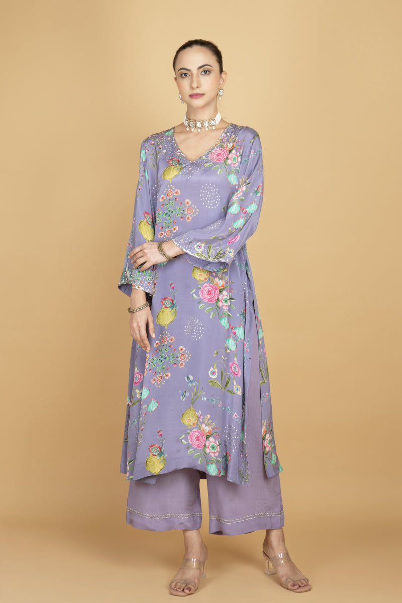 Featuring a purple floral printed kurta adorned with intricate sequin work. It is paired with solid black crepe pants for a sleek silhouette and a plain black organza dupatta.