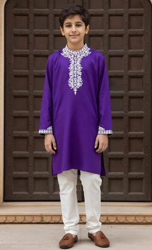 Add this simple yet intricately crafted Kurta-Pant set to your champ's ethnic wear collection. It comes in purple and off-white majestic hues, along with fine embroidery on the kurta. This outfit comes without lining, and it is made of fine-quality glace cotton.