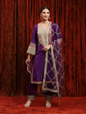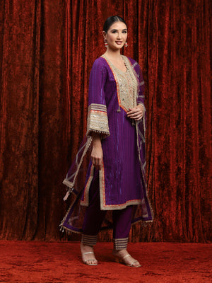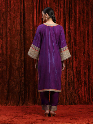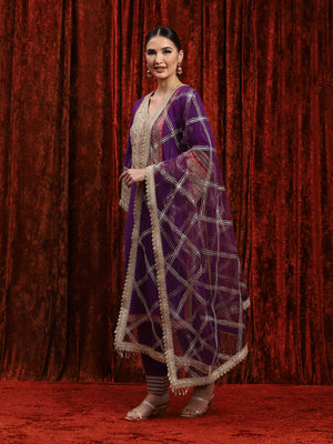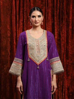 Experience vibrant charm with our Purple and Orange kurta, pant and dupatta set, enriched intricately with Gota, Dori and Badla work. The ensemble is accompanied by a net dupatta, enhancing it’s allure. The silk chanderi pants complements the rich palette, elevating the overall aesthetic. The cotton shimmer kurta, features an exquisite paan neckline, perfectly framing one’s neckline. The set effortlessly merges traditional and contemporary style, resulting in a captivating attire.
