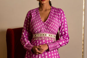 Purple printed anarkali dress with pintucks and net pleats detail comes with mirror and moti embroidered belt.