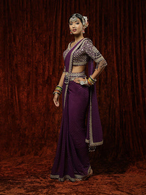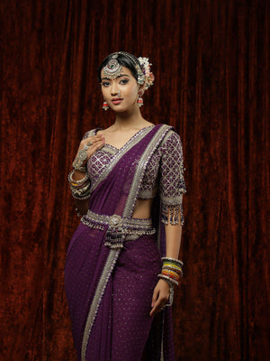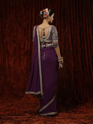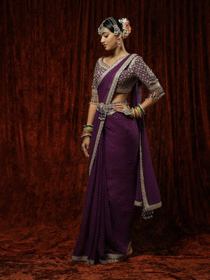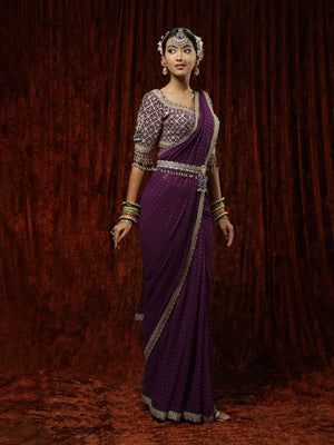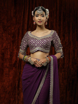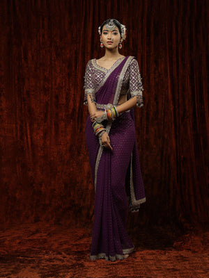 This beautiful purple georgette saree with exquisite detailing of Badla and Kasab work. This saree is paired with a Silk Chanderi blouse with rose gold kasab, pearl and crystal drop detailing. This blouse beautifully complements the saree providing the outfit a classic look!