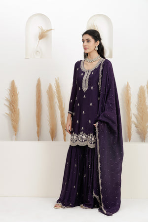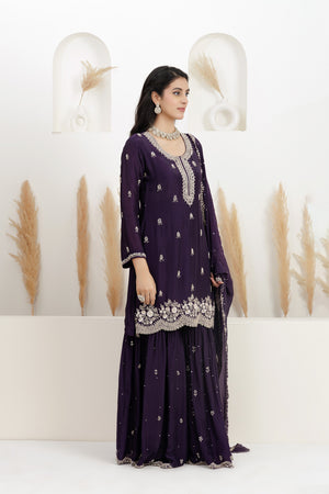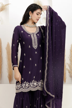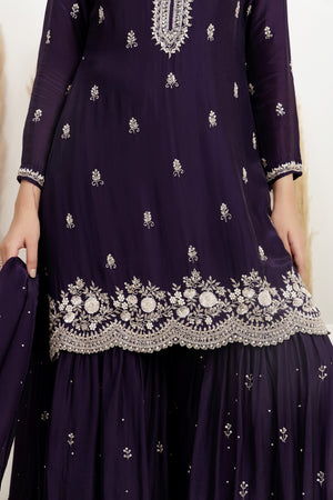 purple kurta in satin silk base with cutdana, beads pearls and sequins embroidery. It is paired with sharara pants and a pure organza heavy dupatta. Accentuate with statement earrings and heels for a festive occasion or sangeet ceremony.