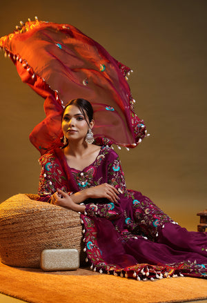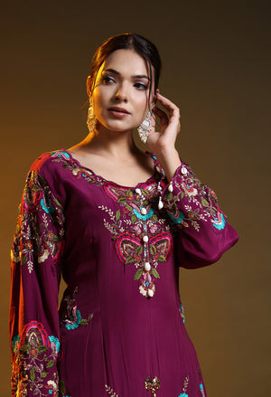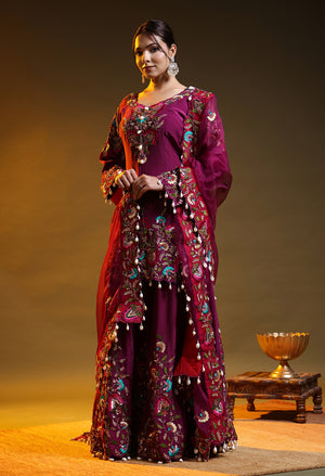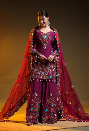 This purple sharara set showcases an elegant festive look with its rich crepe silhouette and soft organza dupatta. Beautifully enhanced with hand embroided zardozi detailing and subtle sequin highlights, the ensemble combines modern sophistication with traditional finesse. The deep purple tone adds a regal touch, making it an ideal choice for parties, wedding celebrations, and special festive occasions.