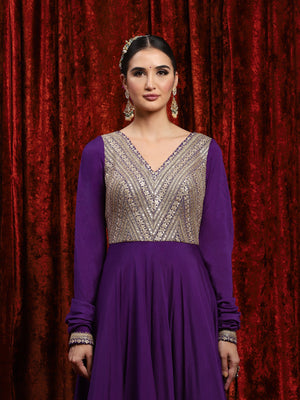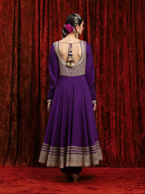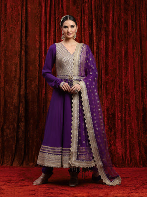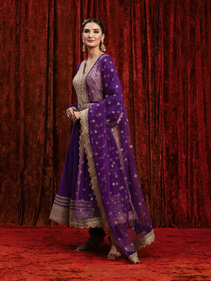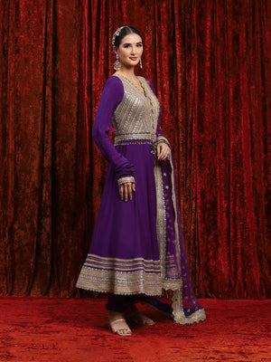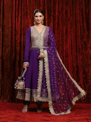 Radiate regal elegance in our purple silk chanderi anarkali suit, embellished with fine gota, dori and badla work. Delicate tassel detailing adorns the ensemble, adding a touch of grace. Paired with a net embroidered dupatta and churidar, it offers a complete traditional look. To cinch the waist with flair, a belt embellished with delicate tassels adds graceful flourish to one's look.