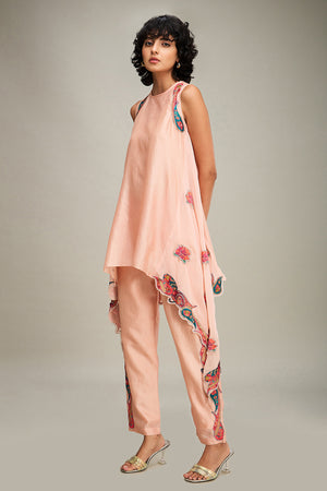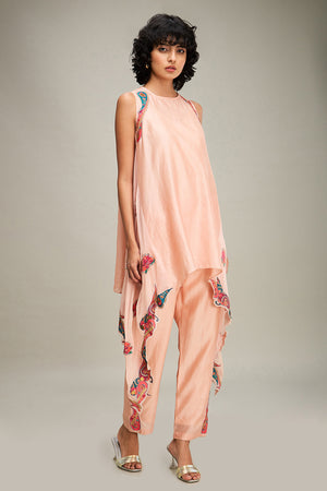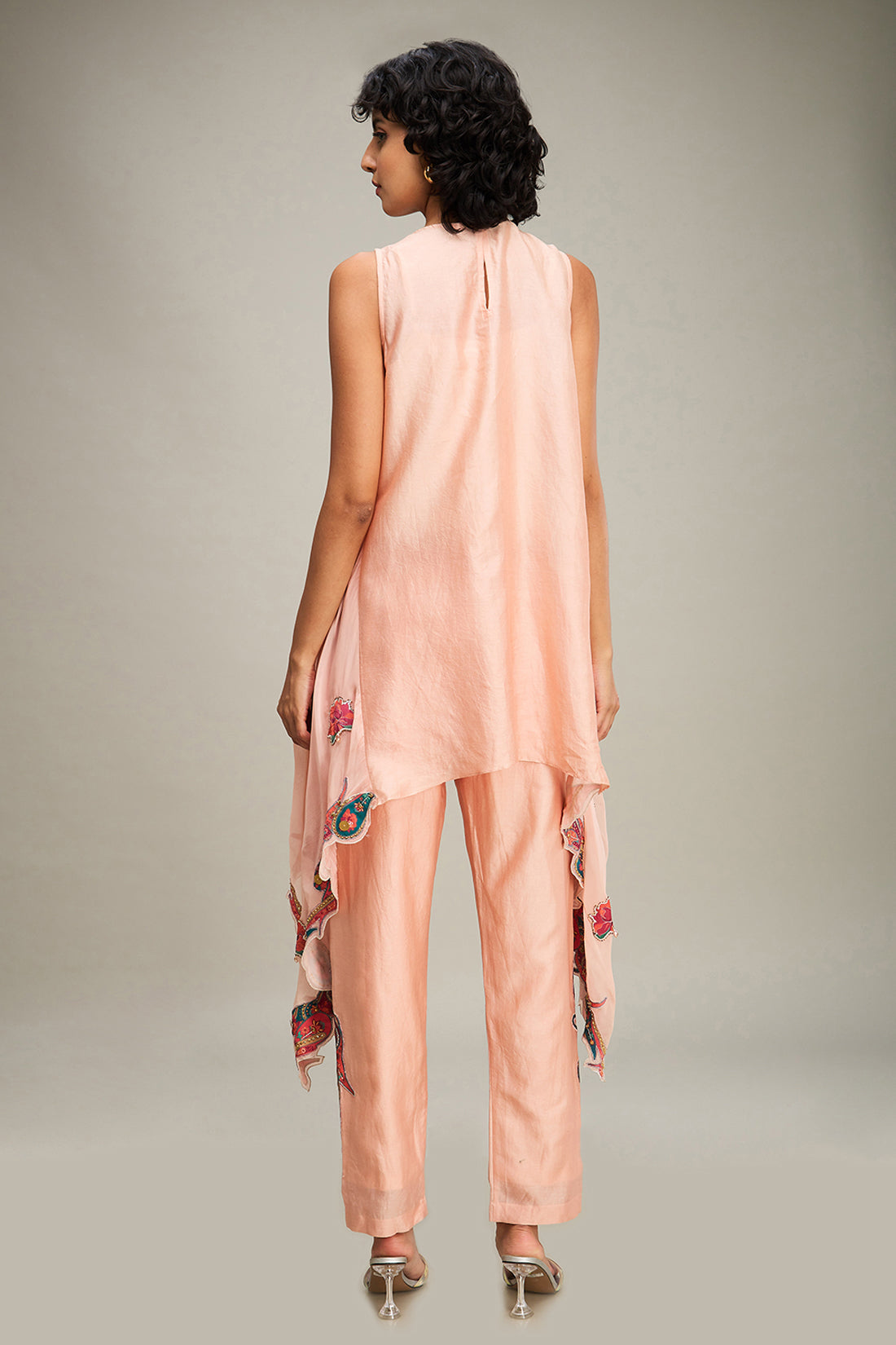 Peach Qala Appliqued Asymmetric Kurta with Pants in Linen.