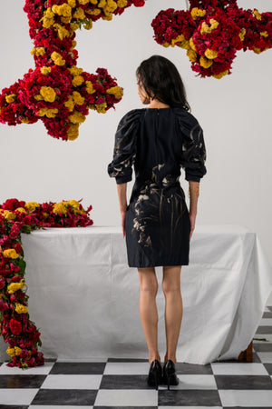 Turn heads and revive your wardrobe with the Rosy Revival Dress, a chic creation in black vintage floral Chanderi. This short dress boasts a deep incut shoulder and puffy sleeves that start from the neckline, merging classic romance with modern edge. Abstract wavy leather binding on the front panels adds a touch of chic, while black leather detailing on the round neckline and cuffs elevates the look. Miniature golden studs on the sleeves add a hint of glitz, making this dress a standout choice for a bold and stylish statement.