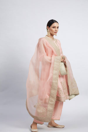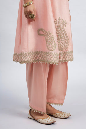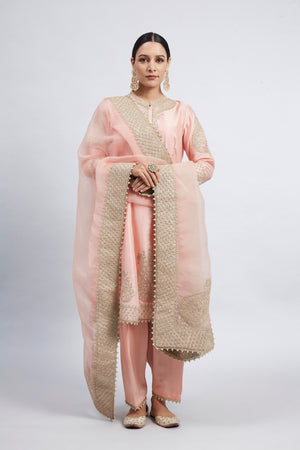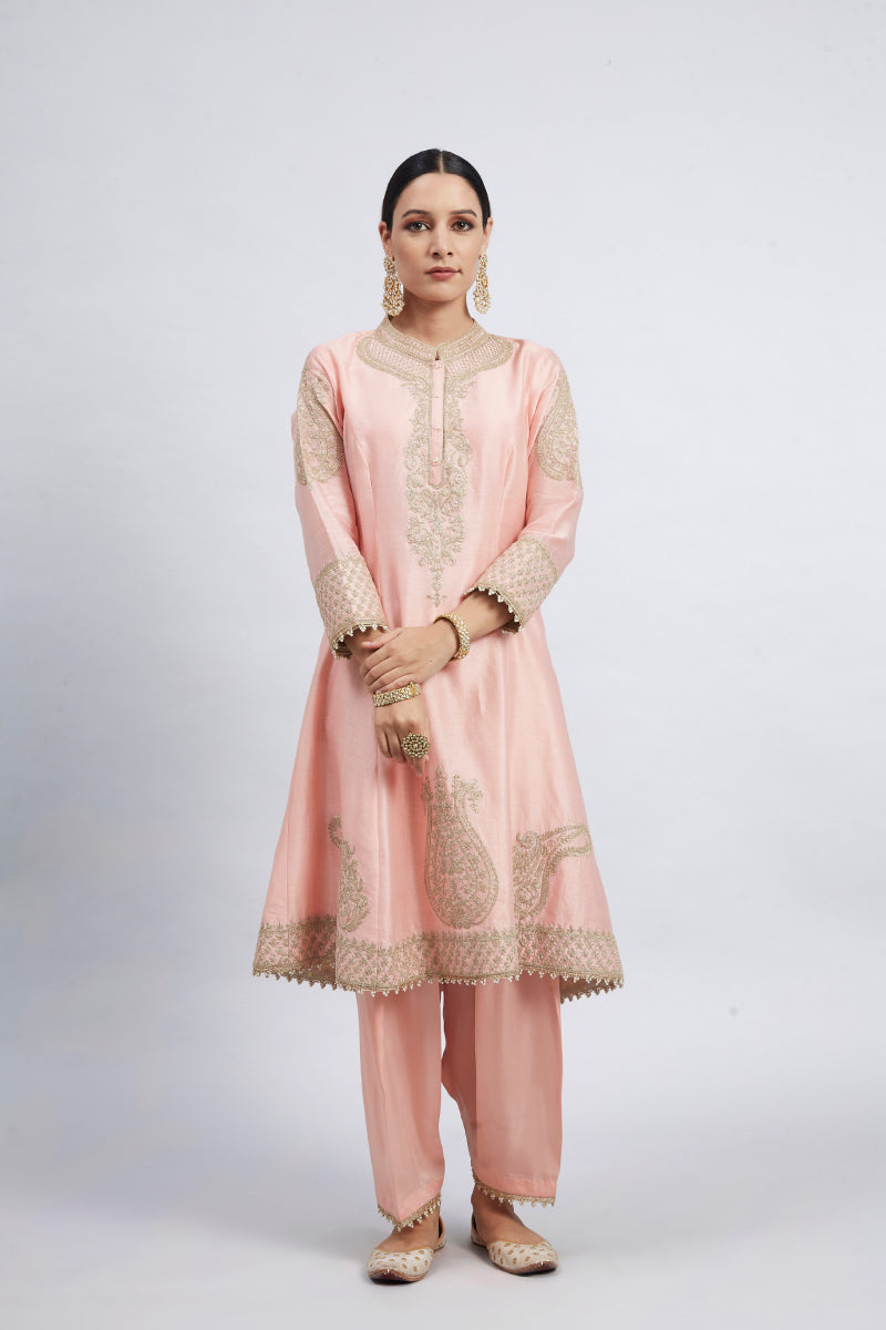 The Rahbya ensemble from our Firozah collection adornes a princess-cut with heritage Kashmiri Tilla Embroidery. It features a Mandarin collar with a placket and three-quarter sleeves. The look comes together with a salwar and a silk organza dupatta. The outfit is finished using an exclusive Chanderi Silk Banarsi fabric and Pearls.