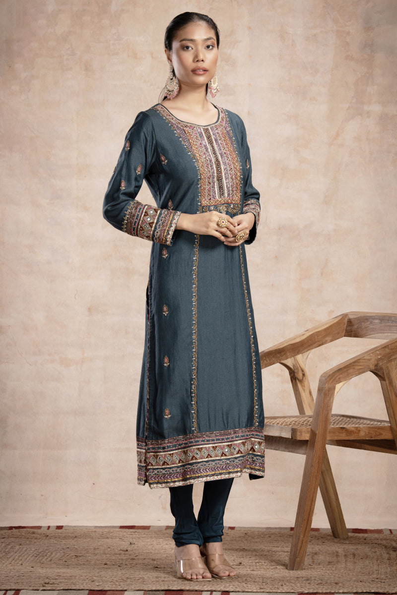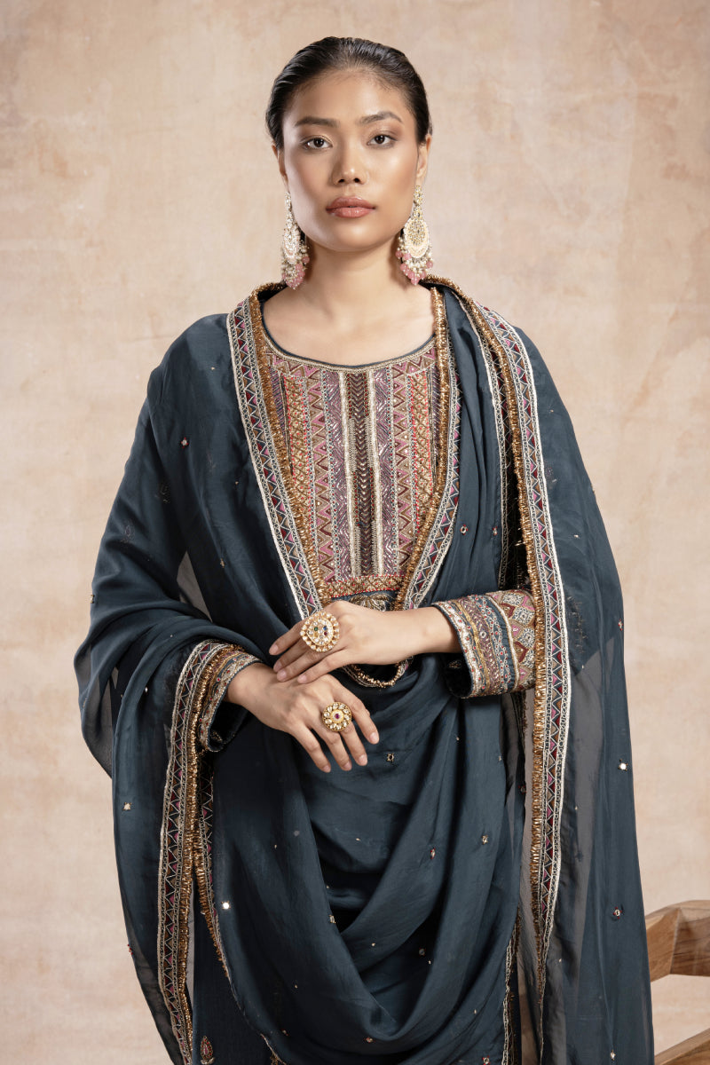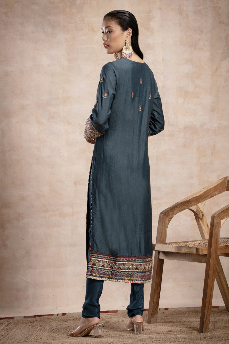 STYLE TIP : Accentuate with statement jewellery and heels for any festive occasionents : 3 (Kurta + Churidar + Dupatta)ic -Tussar