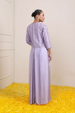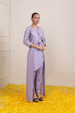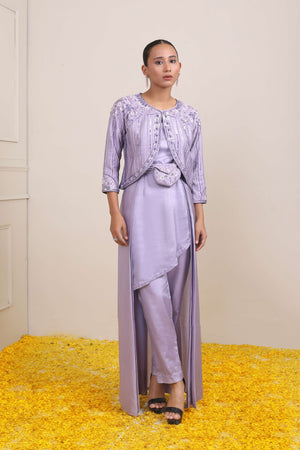 Lilac Embroidered One Hook Jacket With Asymmetric Inner And Flair At The Back Paired With Pants And Belt Bag To Give Enhancement As The Waist Line