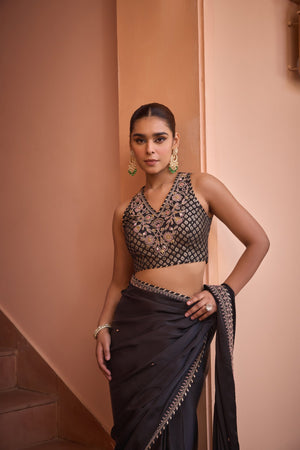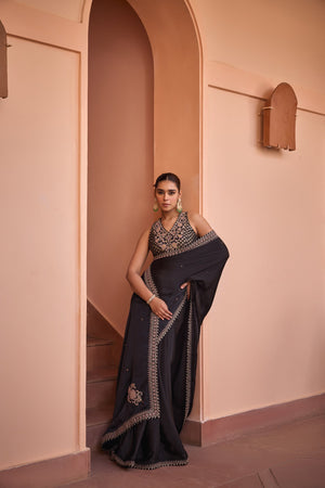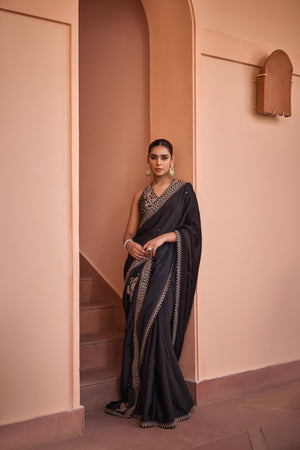 Featuring a timeless six yards Pure satin saree and chanderi jacquard blouse. Both exquisitely embroidered with intricate tilla work, dori, pearls, brass sequins and beads. Accessorize it with danglers or studs to elevate any festive look.
