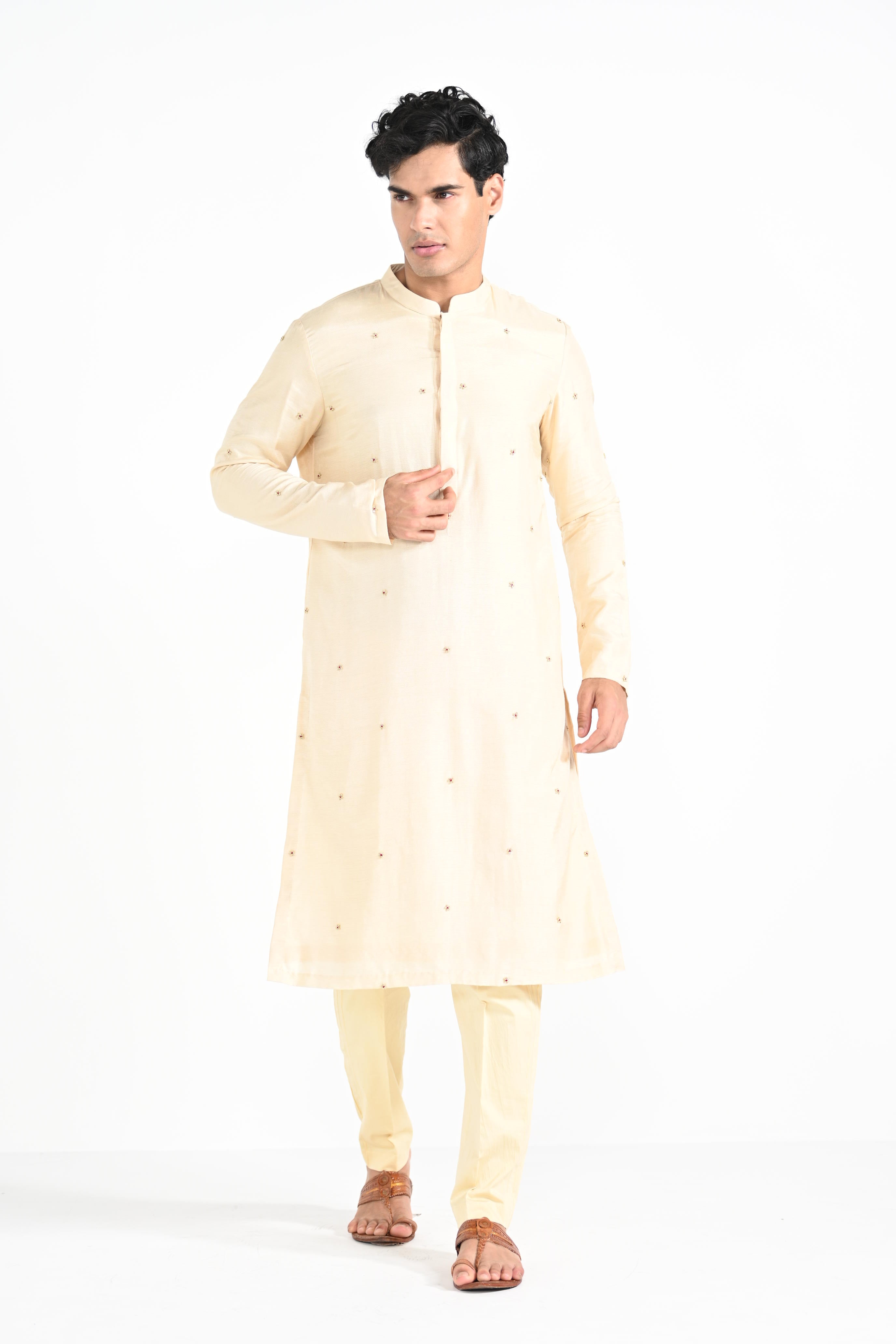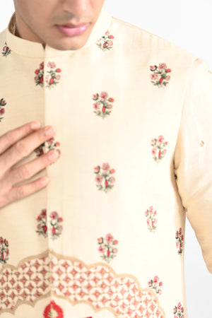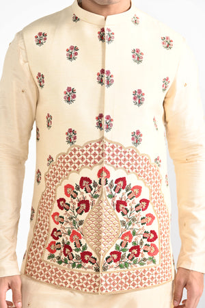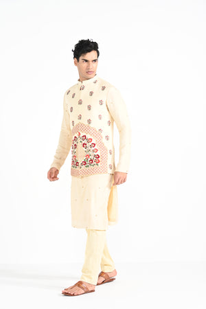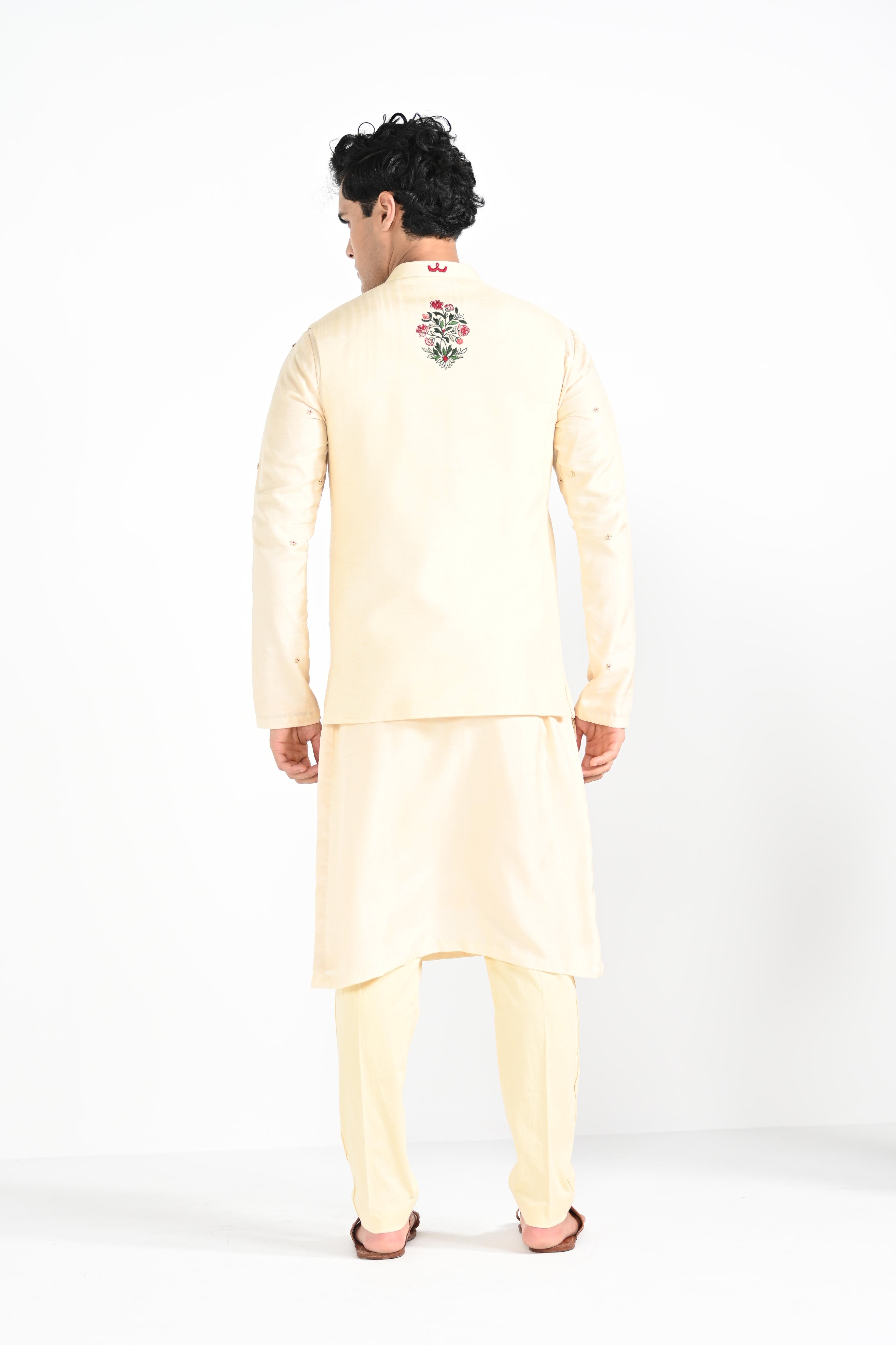 Rajasthani floral Hand embroidered nehru kurta set made in cream bamberg raw silk. Paired with cream slim fit Pant Pajama. Color of the actual garment may vary due to lighting conditions during the shoot .