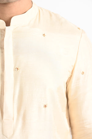 Rajasthani Floral thread work embroidered on bamberg raw silk.Paired with Buttercream slim fit Pant Pajama. Color of the actual garment may vary due to lighting conditions during the shoot .