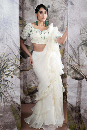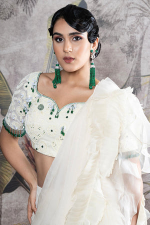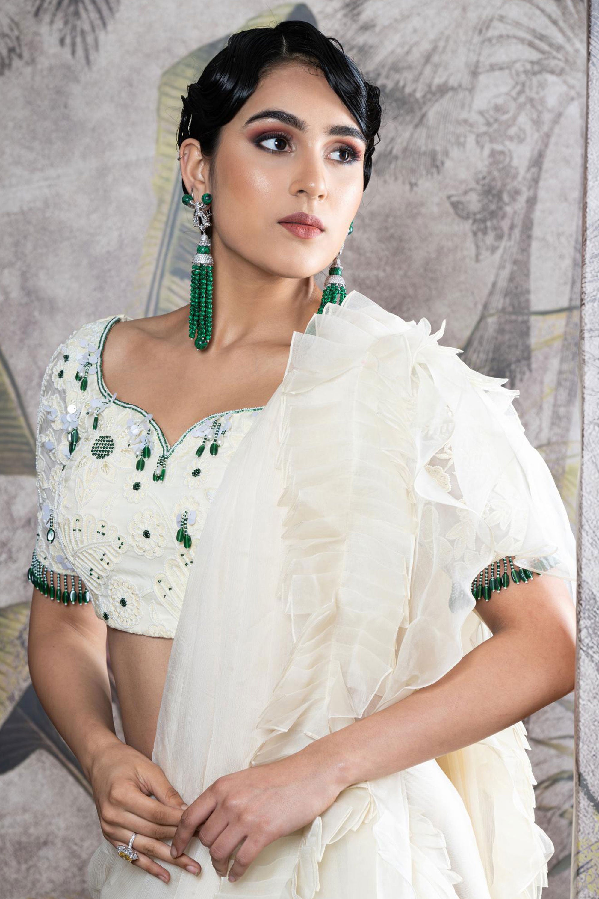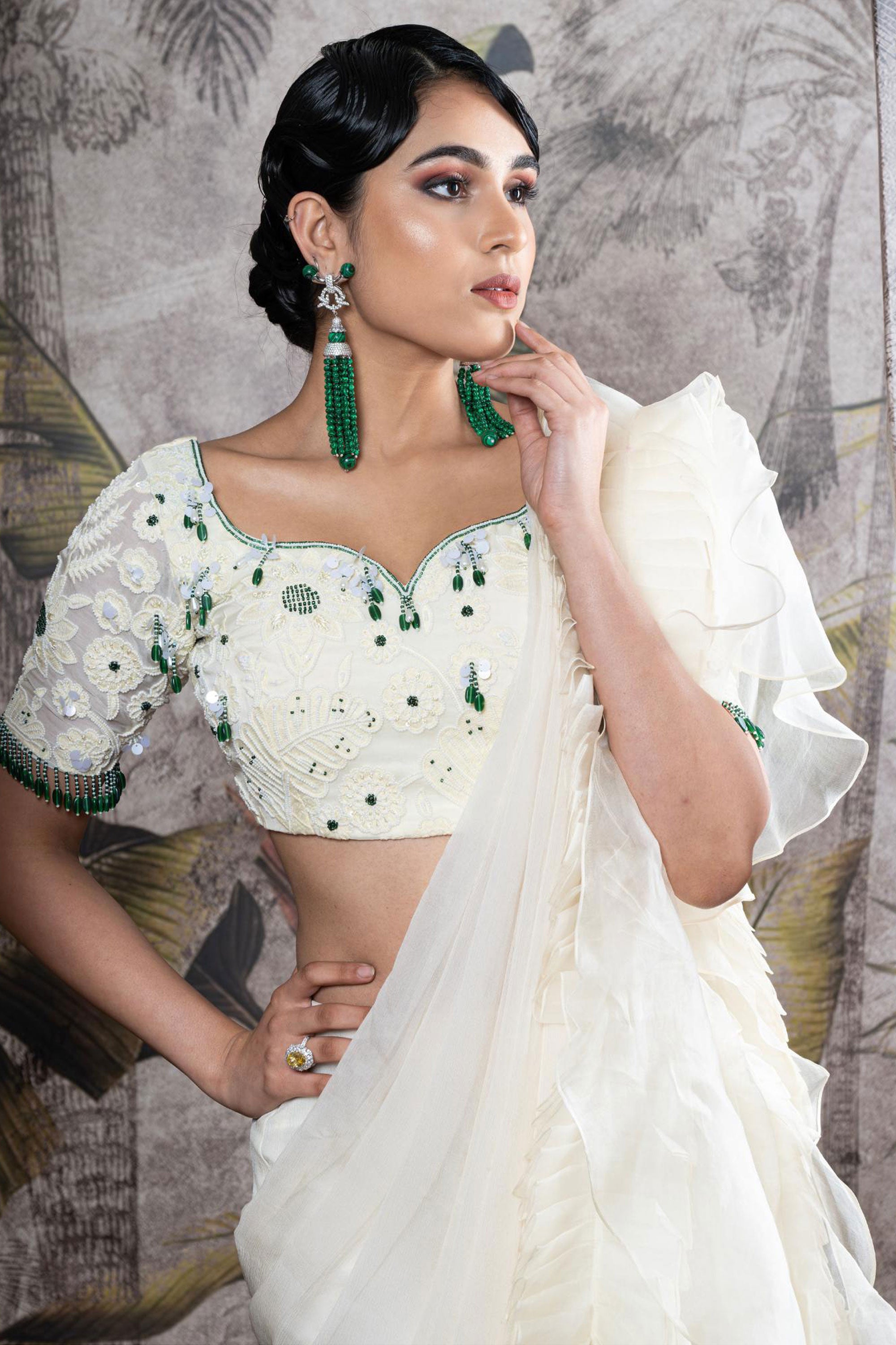 This vintage floral blouse with its intricate embroidery, pearls, mother of pearl, and emerald green stones etc gives off a royal vintage Indian vibe with a modern twist. It's the perfect fusion of traditional and contemporary elements, adding a unique and fashionable touch to your ensemble. Paired with the luxurious organza silk pre-drape saree, it creates a timeless and trendy look. Get ready to make a statement with your royal vintage Indian vibe with a modern twist!