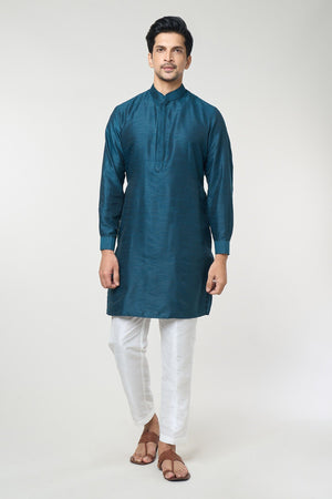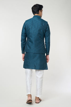 Rama Green dupion silk based open jacket, enhanced with diamond pintuck embroidery, paired with a matching embroidered dupion silk kurta and an off white dupion silk based mexican pants.