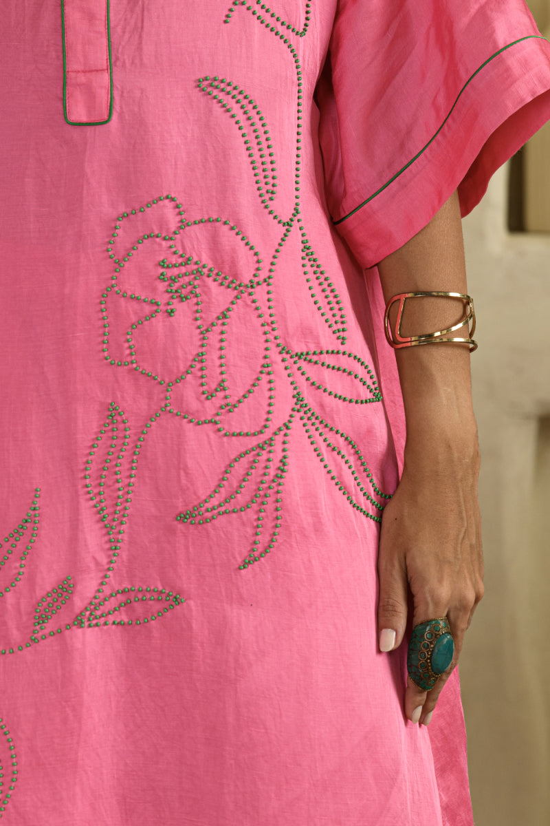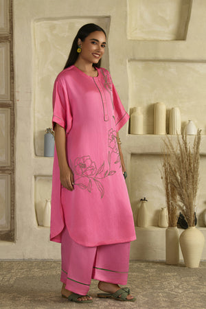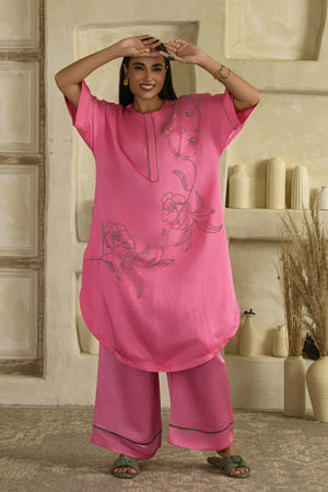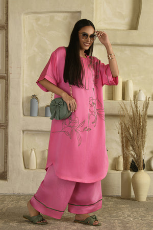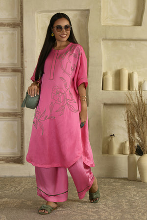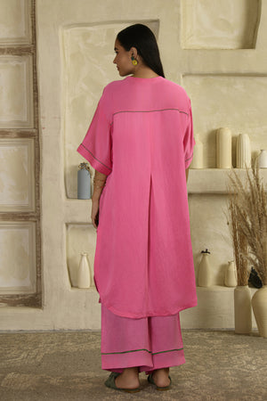 Elevate your style game with this sharbati pink co-ord set, designed to seamlessly blend comfort with elegance.The set features a long hand embroidered kurta with contrast pink bead work adorned with contrast pink piping along the edges