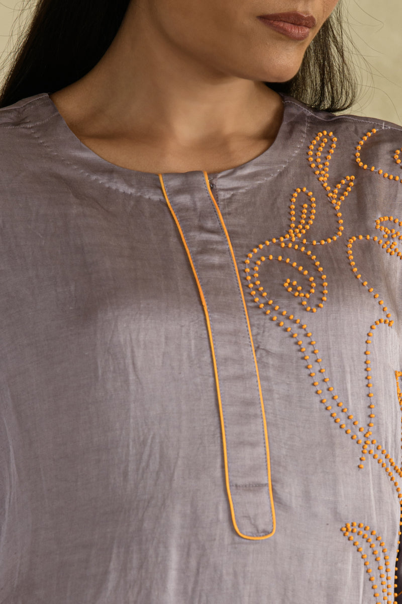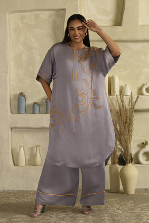 Elevate your style game with this tarangi lilac co-ord set, designed to seamlessly blend comfort with elegance.The set features a long hand embroidered kurta with contrast pink bead work adorned with contrast pink piping along the edges