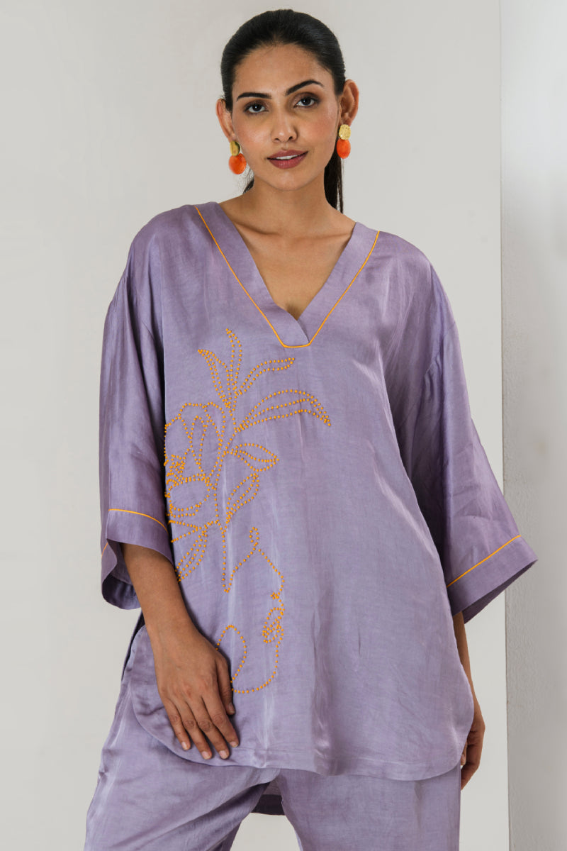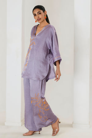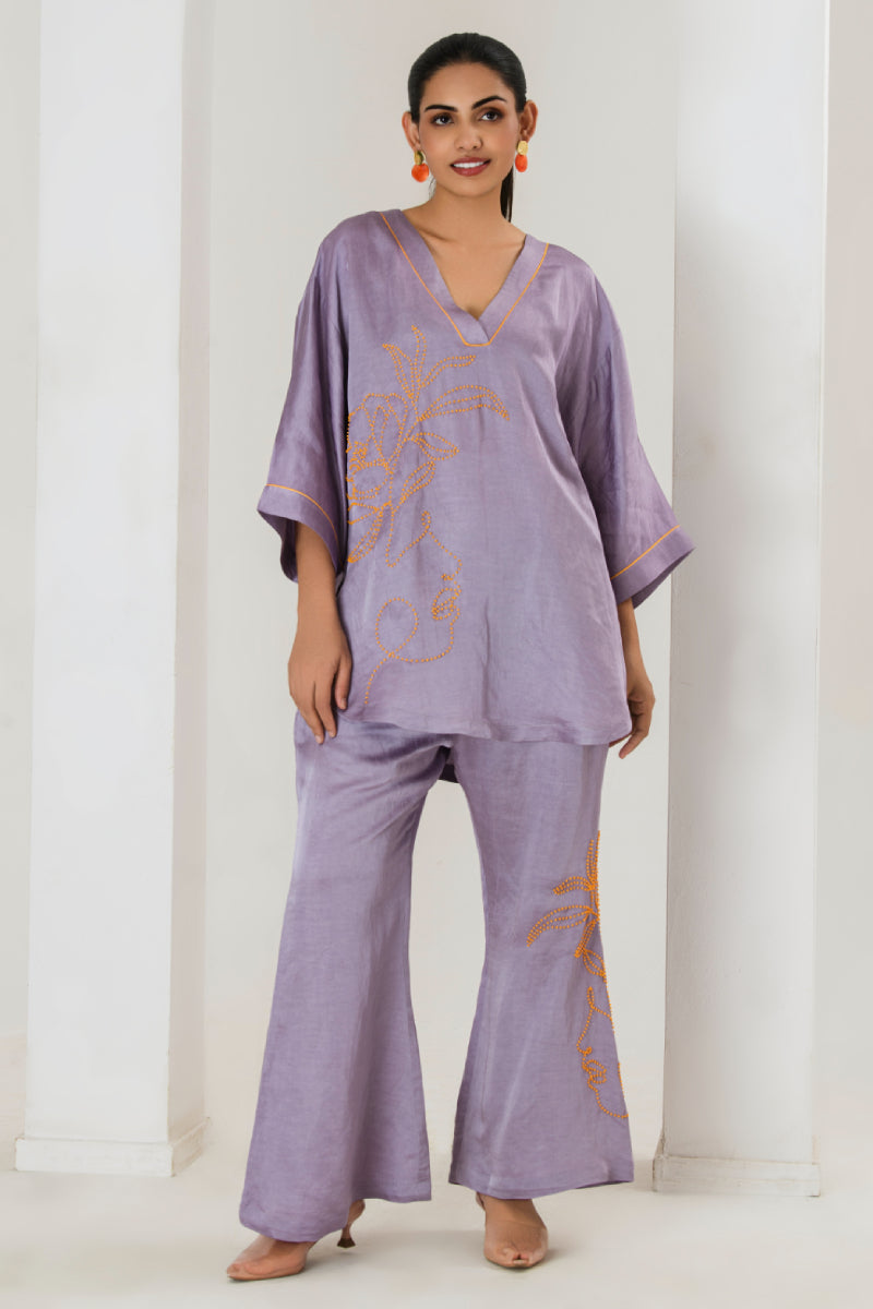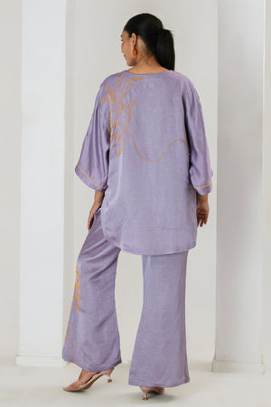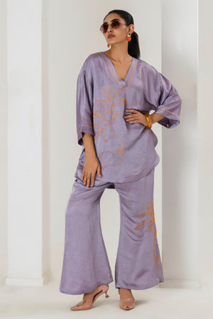 Elevate your style game with this tarangi lilac co-ord set, designed to seamlessly blend comfort with elegance.The set features a short hand embroidered kurta with contrast orange bead work adorned with bell bottom pants with bead work
