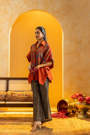 Maroon Rangtara embellished shirt, paired with printed straight pants in chanderi.