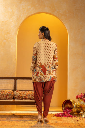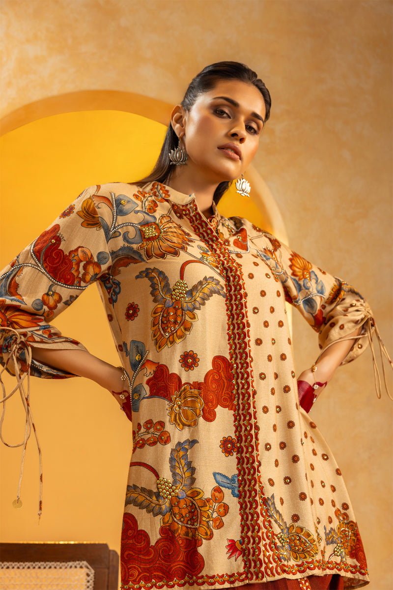 Beige Rangtara Embellished kurta with gathered sleeve, paired with dhoti style pants in cotton silk.