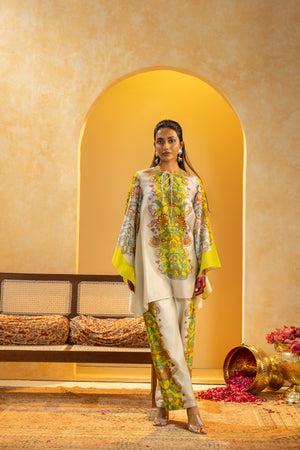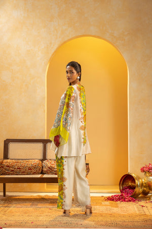 Off-white Rangtara embellished kurta with fllaired sleeves, paired with printed straight pants in chanderi.