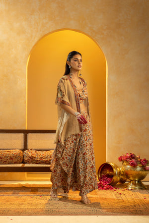 Beige Rangtara embellished bustier and layred pants, paired with front tie-up cape in organza.